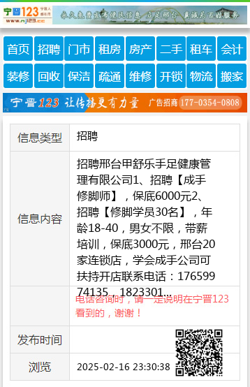 招聘邢台甲舒乐手足健康管理有限公司1、招聘【成手修脚师】,保底6000元2、招聘【修脚学员30名】,年龄18-40,男女不限,带薪培训,保底3000元,邢台20家连锁店,学会成手公司可扶持开店联系电话:17659974135,18233019982 聘