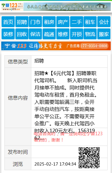 招聘★【6元代驾】招聘兼职代驾司机。 新入职司机当月接单不抽成。同时提供代驾电动车租赁,首月免租金。入职需要驾龄满三年,会开手动自动挡汽车,按距离接单公平公正。不需要每天开会推广。每天晚上代驾四小时收入120元左右。15631962533(同 ) 聘