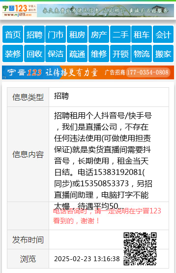 招聘租用个人抖音号/快手号,我们是直播公司,不存在任何违法使用(可做使用担责保证)就是卖货直播间需要抖音号,长期使用,租金当天日结。电话15383192081( 同步)或15350853373,另招直播间助理,电脑打字不能太慢,待遇平均5000 聘