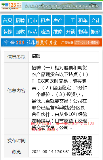 招聘〈一〉相对股票和期货农产品现货有以下特点(1)T+0双向既时交易,随买随卖,(2)盘面稳定,1分钟一个点位,(3)投资小,最低几百就能交易!公司在邢台已运营8年诚招各区县合作伙伴,由从业10年经验老师指导(日节收益)收现货交易学员,公司提供学习帐号,要求对股票期货有强烈兴趣和果断执行力,出师8000以上(日节)13784897824王老师() 聘 |