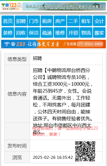 招聘【中鹏物流邢台桥西分公司】诚聘物流专员10名,综合工资3000元~10000元,年龄25到45岁,女性。会说普通话。无需外出,工作轻松,不用找客户,每月团建,公休四天时间自由,能接送孩子。有销售经验者优先。地址:邢台市信都区中兴西大街530号家乐园后面万隆商务中心10楼1015室。电话同 : 19103247773 聘 |