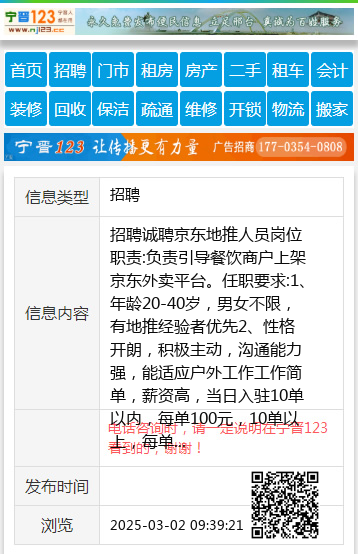 招聘诚聘京东地推人员岗位职责:负责引导餐饮商户上架京东外卖平台。任职要求:1、年龄20-40岁,男女不限,有地推经验者优先2、性格开朗,积极主动,沟通能力强,能适应户外工作工作简单,薪资高,当日入驻10单以内,每单100元,10单以上,每单120元时间自由,不耽误接送孩子,有意向速速报名吧!联系电话:15030486772 聘 |