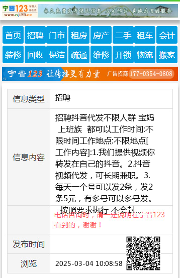 招聘抖音代发不限人群 宝妈 上班族 都可以工作时间:不限时间工作地点:不限地点[工作内容]:1.我们提供视频你转发在自己的抖音。2.抖音视频代发,可长期兼职。3.每天一个号可以发2条,发2条5元,有多号可以多号发。 按照要求执行 不会封号【注意事项]:1.只做抖音2.手机号/ 19931981885