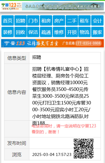 招聘【杭粤情礼宴中心】招楼层经理、厨房各个岗位工资面议,销售经理10000元餐饮服务员3500-4500元传菜生3000-3500元保洁员2500元打扫卫生1500元库管3000-3500元迎宾小时工20元/小时地址钢铁北路消防队对面18830939090前厅13363195168前厅13833921145厨房 聘 |