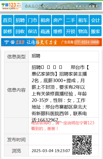 招聘 邢台市【惠亿家装饰】招聘家装主播2名,底薪3000+提成,月薪上不封顶,要求有2年以上有关装修直播经验,年龄20-35岁,性别:女,工作地址:邢台市襄都区泉北大街新眼科医院西邻,联系电话:16632967999张经理。 聘