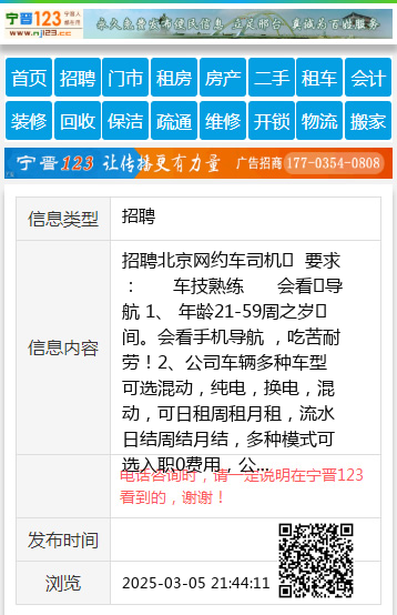招聘北京网约车司机⚠ 要求: 车技熟练 会看导航 1、 年龄21-59周之岁间。会看手机导航 ,吃苦耐劳!2、公司车辆多种车型可选混动,纯电,换电,混动,可日租周租月租,流水日结周结月结,多种模式可选入职0费用,公司负责车辆保养保险维修。可免费试用7天,无任何费用,电话15910662141 同步
