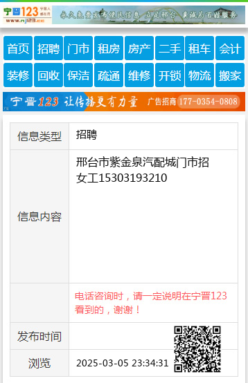 邢台市紫金泉汽配城门市招女工15303193210