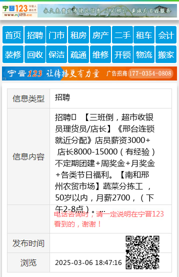 招聘 【三班倒,超市收银员理货员/店长】《邢台连锁就近分配》店员薪资3000+ 店长8000-15000(有经验)不定期团建+周奖金+月奖金+各类节日福利。【南和邢州农贸市场】蔬菜分拣工 ,50岁以内,月薪2700,(下午2-8点)。库管:上午10-12 下午2-8【隆尧包食宿配送司机】50岁以内,熟练驾驶四米二箱货,月薪4500微信19103208981,面试请提前预约。 聘 |