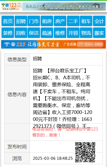 招聘 【邢台君乐宝工厂】招长期C、B、A本司机,不用装卸、缴养保险、全程高速【不卖车,不租车。纯司机】【不能出市司机勿扰,需要跑衡水、保定,廊坊等周边省】收入工资7000-12000元不封顶!乔经理:16632921373(微信同号) 王经理:16632961920 (微信同号)面试地址:邢台开发区创智园7楼704。 聘 |