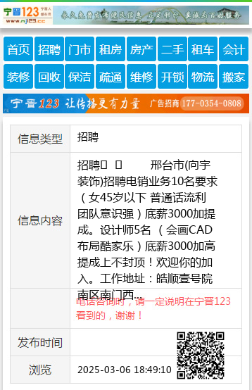 招聘 邢台市(向宇装饰)招聘电销业务10名要求(女45岁以下 普通话流利 团队意识强)底薪3000加提成。设计师5名 (会画CAD布局酷家乐)底薪3000加高提成上不封顶!欢迎你的加入。工作地址:皓顺壹号院南区南门西行50米路北!联系电话:17631988878徐(微信同号) 聘