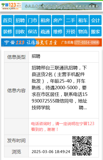 招聘邢台三联通讯招聘,下县送货2名(主营手机配件批发),年龄25-40,开车熟练,待遇2000-5000,要求在市区居住,联系电话15930072555微信同号,地址技师学院 聘