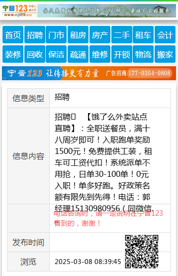 招聘 【饿了么外卖站点直聘】:全职送餐员,满十八周岁即可!入职跑单奖励1500元!免费提供工装,租车可工资代扣!系统派单不用抢,日单30-100单!0元入职!单多好跑。好政策名额有限先到先得!电话:郭经理15130980956(同微信) 聘