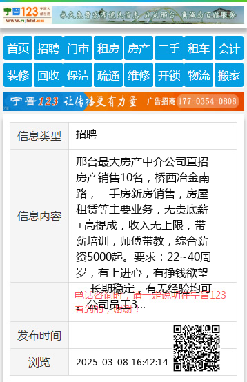 邢台最大房产中介公司直招房产销售10名,桥西冶金南路,二手房新房销售,房屋租赁等主要业务,无责底薪+高提成,收入无上限,带薪培训,师傅带教,综合薪资5000起。要求:22~40周岁,有上进心,有挣钱欲望, 长期稳定,有无经验均可。公司员工300+,八小时工作制,月公休四天,大平台,晋升空间大,月度年度福利。应聘电话:15175973692张。 |