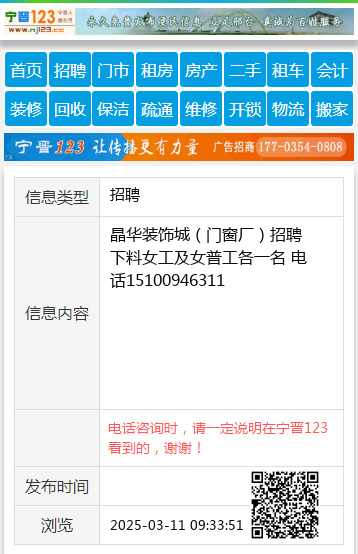 晶华装饰城(门窗厂)招聘下料女工及女普工各一名 电话15100946311