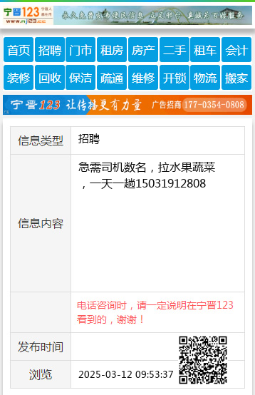 急需司机数名,拉水果蔬菜,一天一趟15031912808