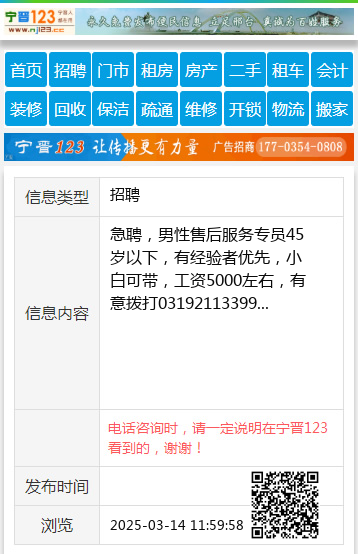 急聘,男性售后服务专员45岁以下,有经验者优先,小白可带,工资5000左右,有意拨打03192113399