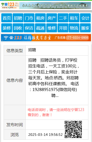 招聘 招聘话务员,打学校招生电话,一天工资100元,三个月后上保险,奖金另计每天发。地点:桥西。另招聘初高中各科任课教师。 电话:19288951975(微信同号) 聘