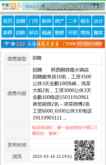 招聘 桥西钢铁路火锅店招聘服务员10名,工资3500公休3天全勤100洗碗,洗菜大姐2名,工资3000公休3天全勤100电话15031910961夜班厨师2名~凉菜师傅2名工资6000_6500公休3天电话19133903111 聘