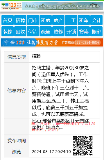 招聘主播,年龄20到30岁之间(退伍军人优先)。工作时间:白班上午十点到下午六点,晚班下午三点到十二点。薪资待遇,试用期七天,试用期后:底薪三千。转正主播以后,底薪三千到五千加提成,也可以无底薪高提成。地点:邢台市襄都区开元南路星悦广场时光台球用品福杆体验中心。联系人,张先生17331905555