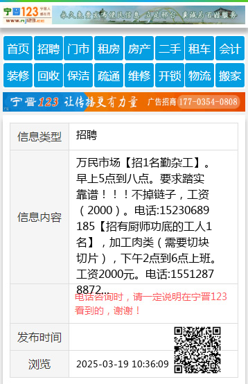 万民市场【招1名勤杂工】。早上5点到八点。要求踏实靠谱!!!不掉链子,工资(2000)。电话:15230689185【招有厨师功底的工人1名】,加工肉类(需要切块切片),下午2点到6点上班。工资2000元。电话:15512878872