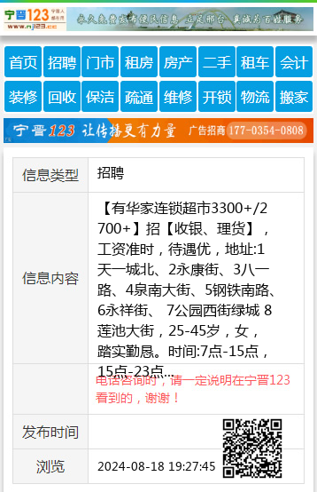 【有华家连锁超市3300+/2700+】招【收银、理货】,工资准时,待遇优,地址:1天一城北、2永康街、3八一路、4泉南大街、5钢铁南路、6永祥街、 7公园西街绿城 8莲池大街,25-45岁,女,踏实勤恳。时间:7点-15点,15点-23点。公休2天 2700-4000.人力:17731911190