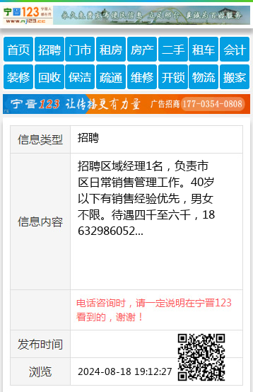 招聘区域经理1名,负责市区日常销售管理工作。40岁以下有销售经验优先,男女不限。待遇四千至六千,18632986052