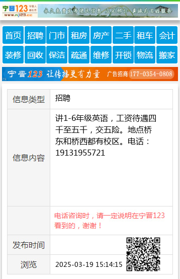 讲1-6年级英语,工资待遇四千至五千,交五险。地点桥东和桥西都有校区。电话:19131955721