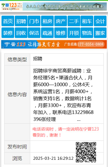 招聘琼宇商贸高薪诚聘:业务经理5名+渠道合伙人,月薪6000—10000,公休4天,系统运营1名,月薪4000+,销售支持1名,数据统计1名,月薪3300+,欢迎有志青年加入,联系电话13229868396张经理 聘