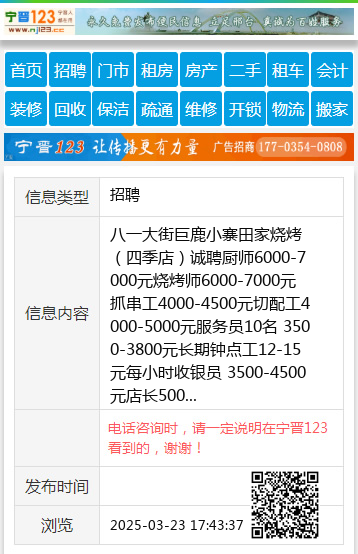 八一大街巨鹿小寨田家烧烤(四季店)诚聘厨师6000-7000元烧烤师6000-7000元抓串工4000-4500元切配工4000-5000元服务员10名 3500-3800元长期钟点工12-15元每小时收银员 3500-4500元店长5000+时间:下午四点到凌晨两点,包吃住,每月1号开工资13831915040(微信同号) |