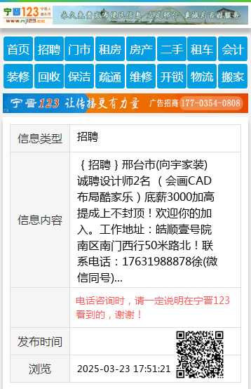 {招聘}邢台市(向宇家装)诚聘设计师2名 (会画CAD布局酷家乐)底薪3000加高提成上不封顶!欢迎你的加入。工作地址:皓顺壹号院南区南门西行50米路北!联系电话:17631988878徐(微信同号)