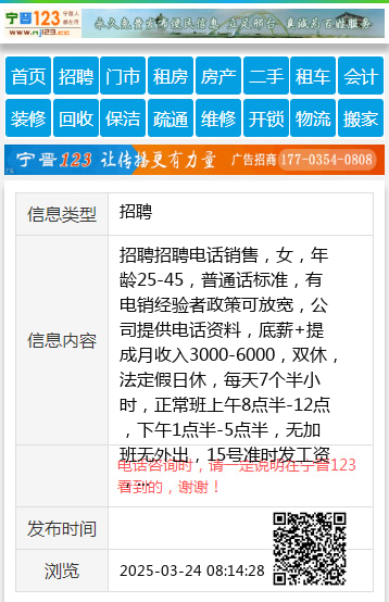 招聘招聘电话销售,女,年龄25-45,普通话标准,有电销经验者政策可放宽,公司提供电话资料,底薪+提成月收入3000-6000,双休,法定假日休,每天7个半小时,正常班上午8点半-12点,下午1点半-5点半,无加班无外出,15号准时发工资,工作长期稳定,公司地址:桥东邯郸路口东城名居电话19131985727 聘 |