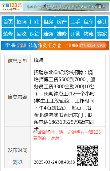 招聘东北碳缸烧烤招聘:烧烤师傅工资5500到7000,服务员工资3300全勤200(10名),长期钟点工(12一个小时)学生工工资面议,工作时间下午4点到12点,地点:冶金北路鸿溪书香园东门,联系电话18631952979微信同步 聘