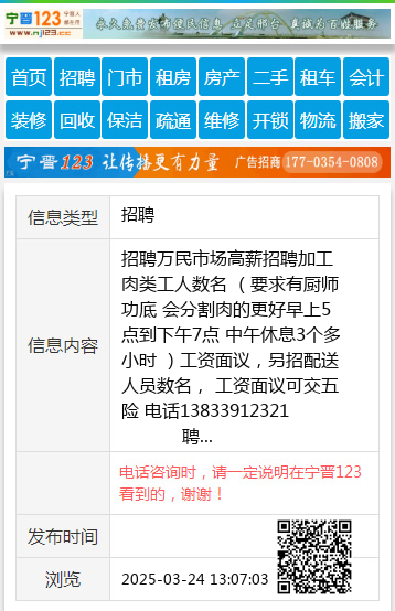 招聘万民市场高薪招聘加工肉类工人数名 (要求有厨师功底 会分割肉的更好早上5点到下午7点 中午休息3个多小时 )工资面议,另招配送人员数名, 工资面议可交五险 电话13833912321 聘