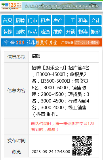 招聘【厨乐公司】招库管4名, 3000-4500 ;收银员2名, 3500-5000 ;售货员6名,3000 -6000;销售助理:2800-4500;理货员:3名,3000-4500;行政内勤4名,3000-4000;线上销售(抖音 制作 直播 文案)4名4000 -8000。学徒:4名工资面议,20-40岁,只招长期、交五险。电话:15732956888,17659961999 孙总。 聘 |