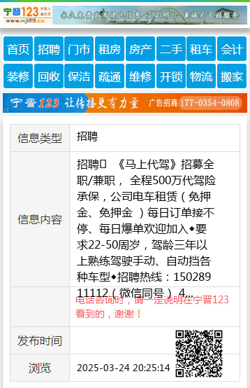 招聘 《马上代驾》招募全职/兼职, 全程500万代驾险承保,公司电车租赁(免押金、免押金 )每日订单接不停、每日爆单欢迎加入◆要求22-50周岁,驾龄三年以上熟练驾驶手动、自动挡各种车型◆招聘热线:15028911112(微信同号) 400-0319-717 地址:中华路168号(一中对面58家政二楼) 聘