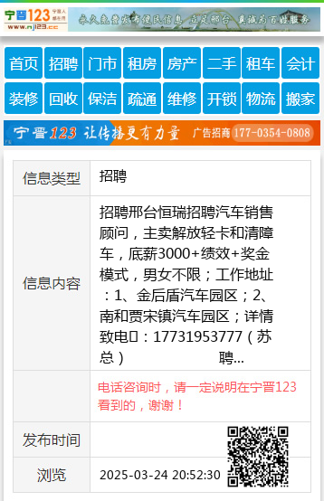 招聘邢台恒瑞招聘汽车销售顾问,主卖解放轻卡和清障车,底薪3000+绩效+奖金模式,男女不限;工作地址:1、金后盾汽车园区;2、南和贾宋镇汽车园区;详情致电☎:17731953777(苏总) 聘