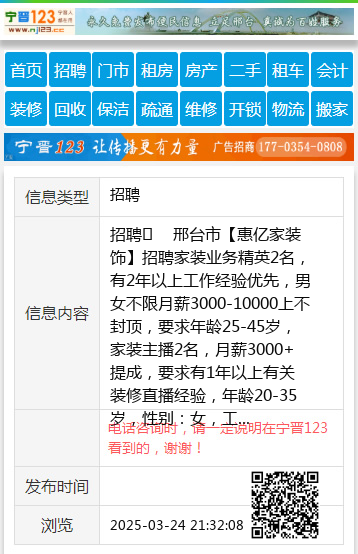 招聘 邢台市【惠亿家装饰】招聘家装业务精英2名,有2年以上工作经验优先,男女不限月薪3000-10000上不封顶,要求年龄25-45岁,家装主播2名,月薪3000+提成,要求有1年以上有关装修直播经验,年龄20-35岁,性别:女,工作地址:邢台市襄都区泉北大街新眼科医院西邻,联系电话:16632967999张经理。 聘 |
