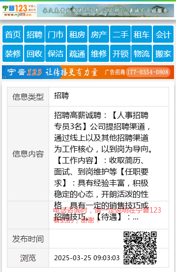 招聘高薪诚聘:【人事招聘专员3名】公司提招聘渠道,通过线上以及其他招聘渠道为工作核心,以到岗为导向。【工作内容】:收取简历、面试、到岗维护等【任职要求】:具有经验丰富,积极稳定的心态,开朗活泼的性格,具有一定的销售技巧或招聘技巧。【待遇】:无责底薪2500元+300元(全勤)+可持续提成【电话】:19061697954(同微)王老师 聘 |