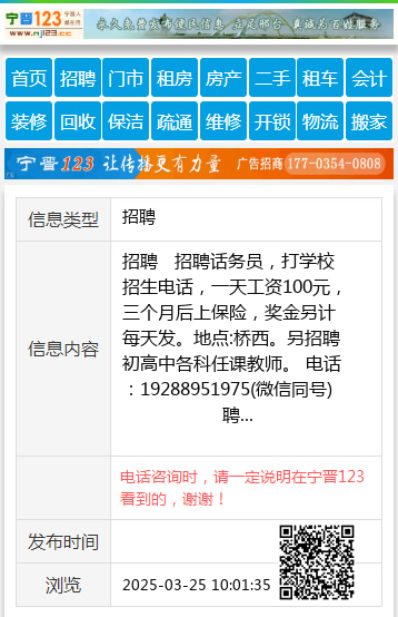 招聘 招聘话务员,打学校招生电话,一天工资100元,三个月后上保险,奖金另计每天发。地点:桥西。另招聘初高中各科任课教师。 电话:19288951975(微信同号) 聘