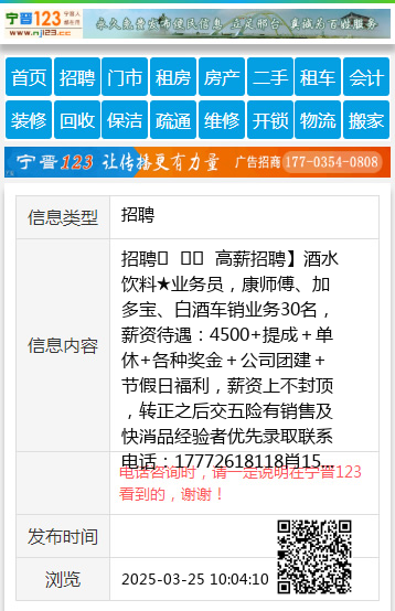 招聘 高薪招聘】酒水饮料★业务员,康师傅、加多宝、白酒车销业务30名,薪资待遇:4500+提成+单休+各种奖金+公司团建+节假日福利,薪资上不封顶,转正之后交五险有销售及快消品经验者优先录取联系电话:17772618118肖15131352030刘公司地址:守敬南路邢台第一农业生产资料总公司大院里-聚宽商贸 聘