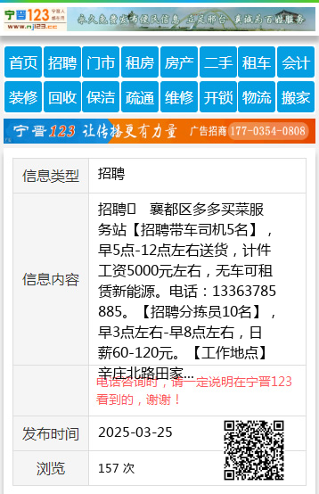 招聘 襄都区多多买菜服务站【招聘带车司机5名】,早5点-12点左右送货,计件工资5000元左右,无车可租赁新能源。电话:13363785885。【招聘分拣员10名】,早3点左右-早8点左右,日薪60-120元。【工作地点】辛庄北路田家庄附近。电话:15632931234。 聘