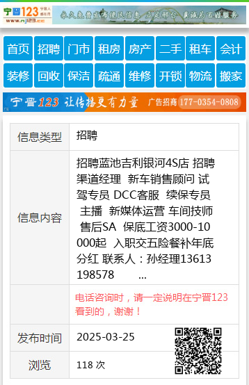 招聘蓝池吉利银河4S店 招聘渠道经理 新车销售顾问 试驾专员 DCC客服 续保专员 主播 新媒体运营 车间技师 售后SA 保底工资3000-10000起 入职交五险餐补年底分红 联系人:孙经理13613198578 聘