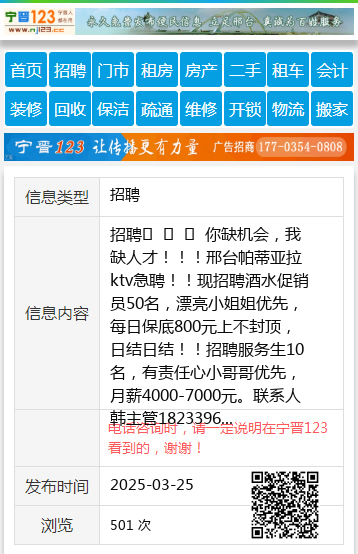 招聘 你缺机会,我缺人才!!!邢台帕蒂亚拉ktv急聘!!现招聘酒水促销员50名,漂亮小姐姐优先,每日保底800元上不封顶,日结日结!!招聘服务生10名,有责任心小哥哥优先,月薪4000-7000元。联系人韩主管18233965544(下午两点以后联系) 聘
