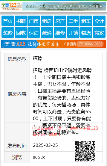 招聘 桥西机电学院附近急聘!!!全职口播主播和锻炼主播,男女不限,年龄不限,口播主播需要有直播经验,有带货经验的、表现力好的优先,每天播两场,具体时间可以商量,无责底薪5500,上不封顶,只要你有能力,薪资不是问题,需要空闲时间多,能稳定长期干的小伙伴,随时可来公司面试!!联系电话:13383093083同微 聘