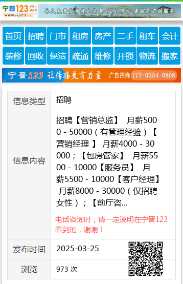 招聘【营销总监】 月薪5000-50000(有管理经验)【营销经理 】 月薪4000-30000;【包房管家】 月薪5500-10000【服务员】 月薪5500-10000【客户经理】 月薪8000-30000(仅招聘女性);【前厅咨客】 月薪5500-10000(仅招女性);【礼宾队员】 月薪3500-10000(退伍军人优先,仅招男性);要求:18周岁以上,热爱夜店文化/有相关行业工作经验有本地资源优先录取。筹备期上班时间:下午2:00-19:00面试地址:邢台市信都区守敬北区177号长安壹号俱乐部。电话:18663477710 聘 |