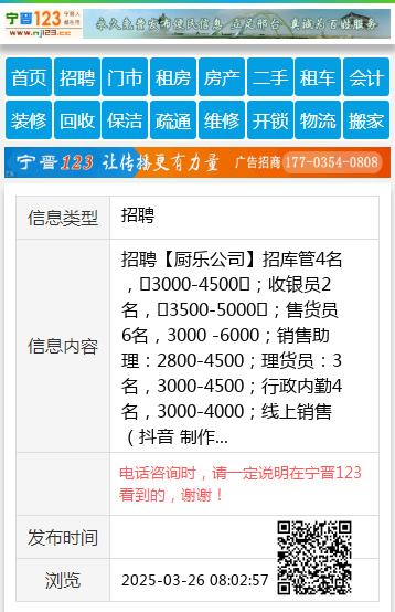 招聘【厨乐公司】招库管4名, 3000-4500 ;收银员2名, 3500-5000 ;售货员6名,3000 -6000;销售助理:2800-4500;理货员:3名,3000-4500;行政内勤4名,3000-4000;线上销售(抖音 制作 直播 文案)4名4000 -8000。学徒:4名工资面议,20-40岁,只招长期、交五险。电话:15732956888,17659961999 孙总。 聘 |