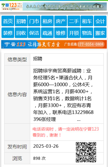 招聘琼宇商贸高薪诚聘:业务经理5名+渠道合伙人,月薪6000—10000,公休4天,系统运营1名,月薪4000+,销售支持1名,数据统计1名,月薪3300+,欢迎有志青年加入,联系电话13229868396张经理 聘
