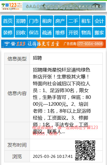 招聘隆尧星悦轩足道纯绿色新店开张!生意极其火爆!特面向社会诚招以下岗位人员:1、足浴师30名,限女性,生熟手皆可,保底:8000元—12000元。2、培训老师:1名,8年以上足浴师经验,工资面议。3、修脚师:1名,手法专业,工资面议。联系人:18832917774。 聘