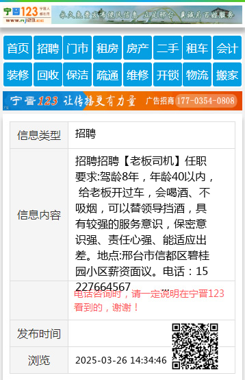 招聘招聘【老板司机】任职要求:驾龄8年,年龄40以内, 给老板开过车,会喝酒、不吸烟,可以替领导挡酒,具有较强的服务意识,保密意识强、责任心强、能适应出差。地点:邢台市信都区碧桂园小区薪资面议。电话:15227664567 聘