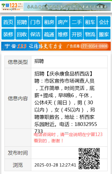 招聘【庆余康食品桥西店】聘:市区宣传市场调查人员,工作简单,时间灵活,底薪+提成,早8晚6,午休,公休4天(周日),男(30以内),女(45以内),另聘兼职数名,地址:桥西家乐园附近。电话:18032955733 聘